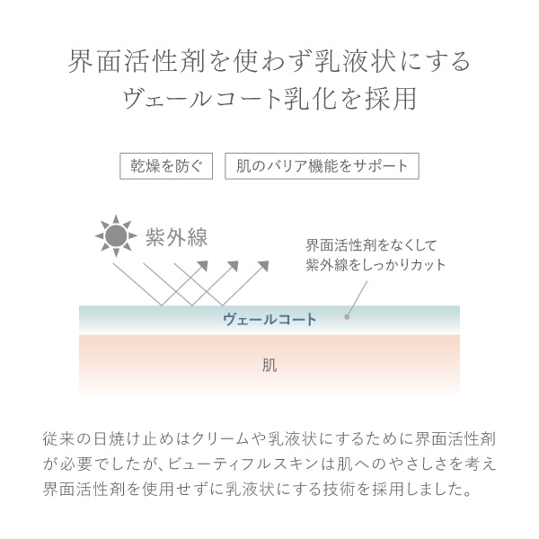 従来の日焼け止めはクリームや乳液状にするために界面活性剤が必要でしたがビューティフルスキンは肌へのやさしさを考え、 界面活性剤を使用せずに乳液状にする技術を採用しました。