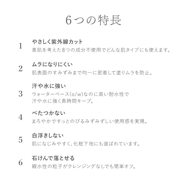 紫外線防止効果を維持するために2~3時間ごとの塗り直しをおすすめします。 顔だけでなく、ボディにもお使いいただけます。